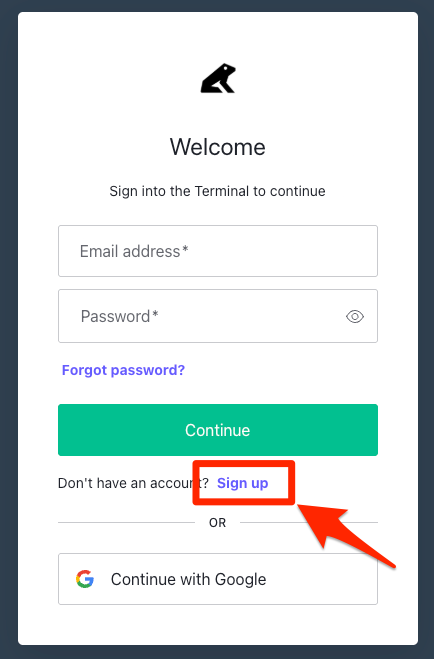 - Then enter your email address, set a password, and click “Continue”.