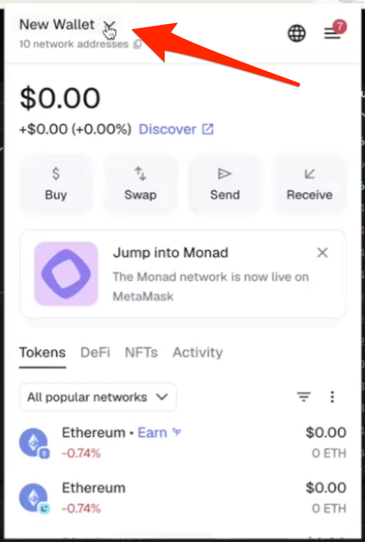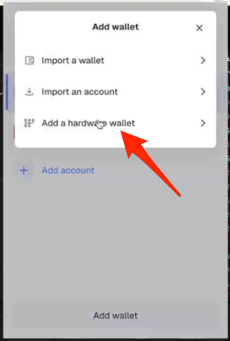 - Open up Metamask, click the dropdown next to your account name, then click “Add wallet” > “Add a hardware wallet”: