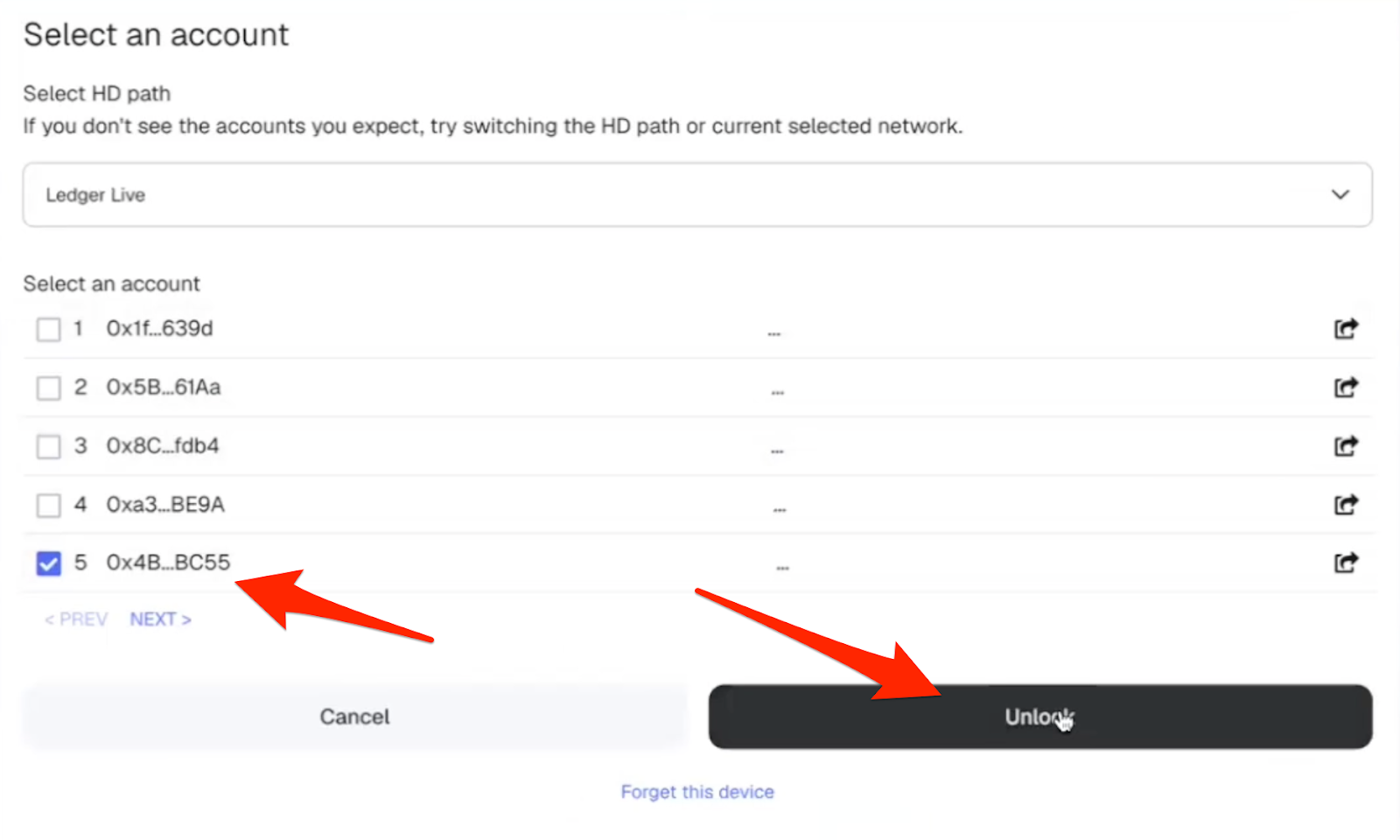 - Choose the correct account (make sure to choose the option that matches the address of the Arbitrum account you created on your hardware device for this), then click “Unlock”: