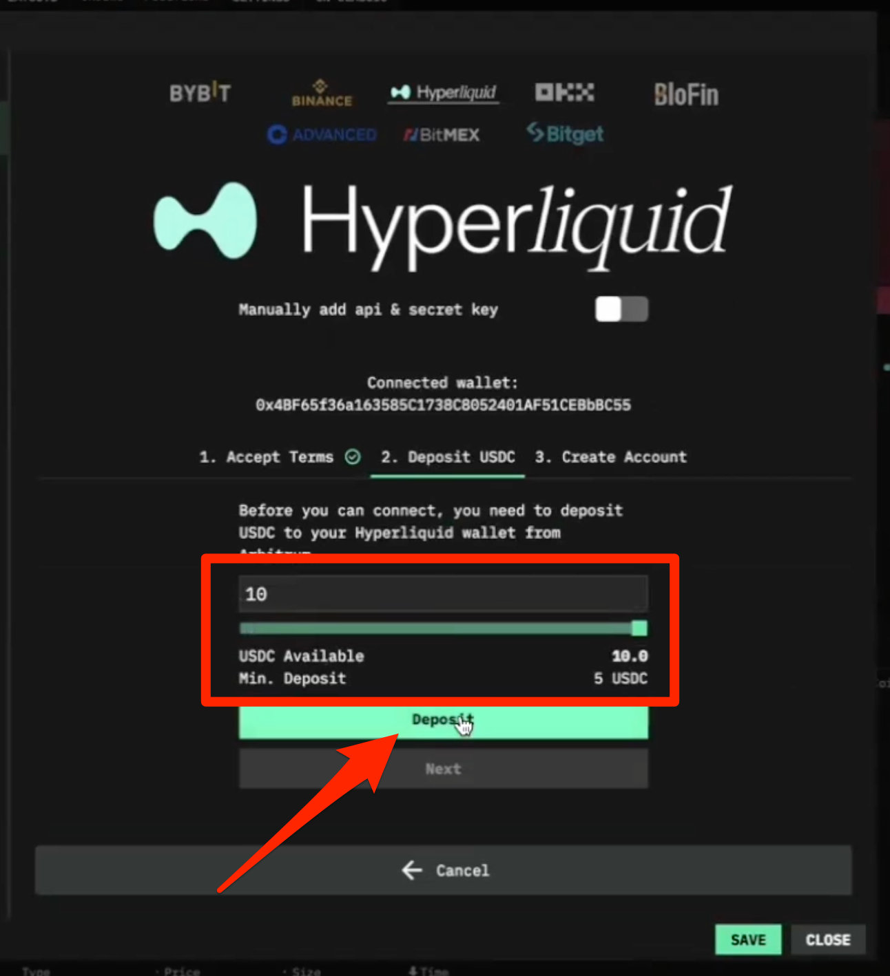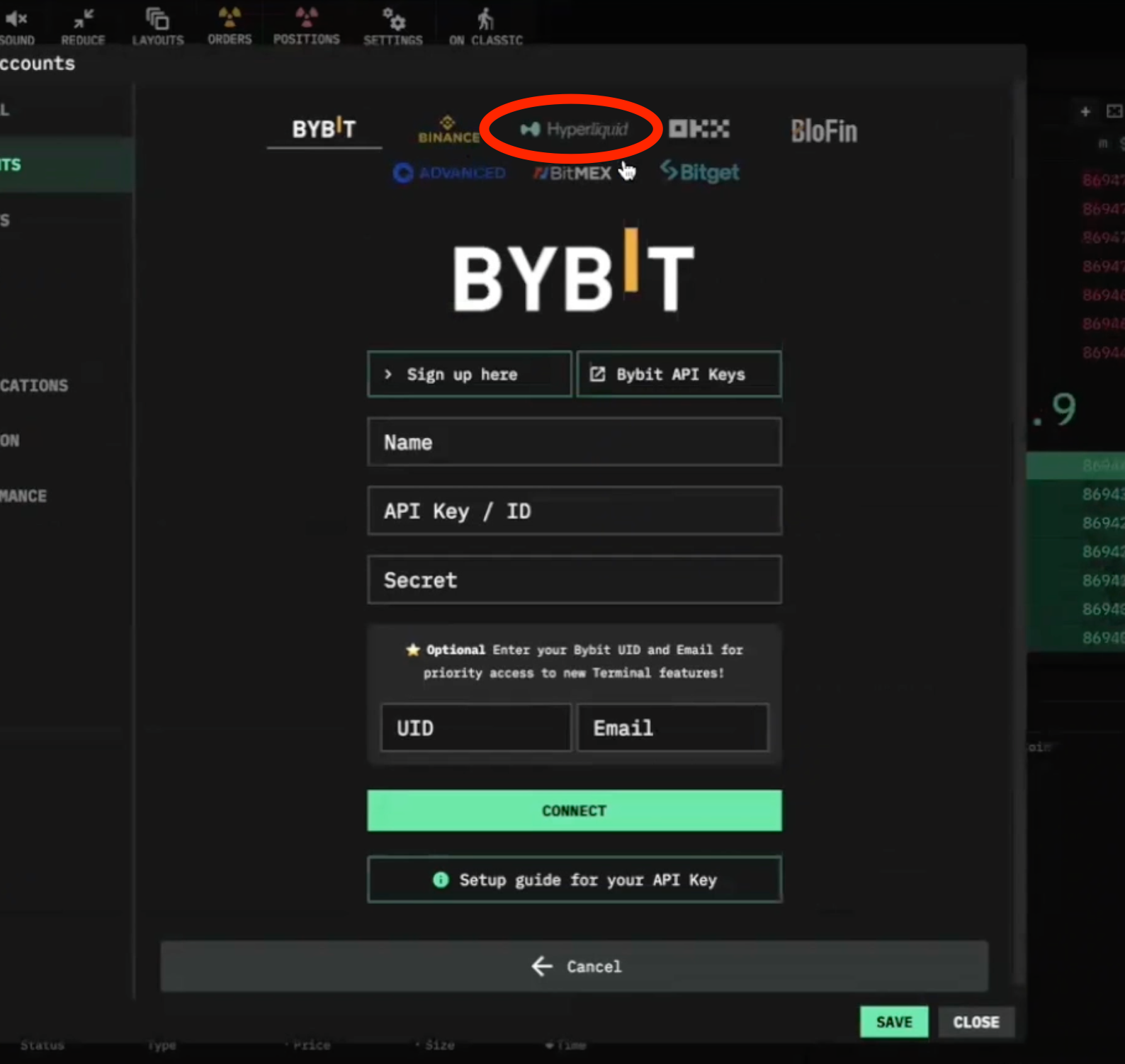 - Choose Hyperliquid from the available options at the top of the modal: