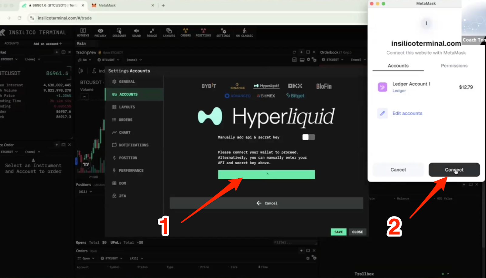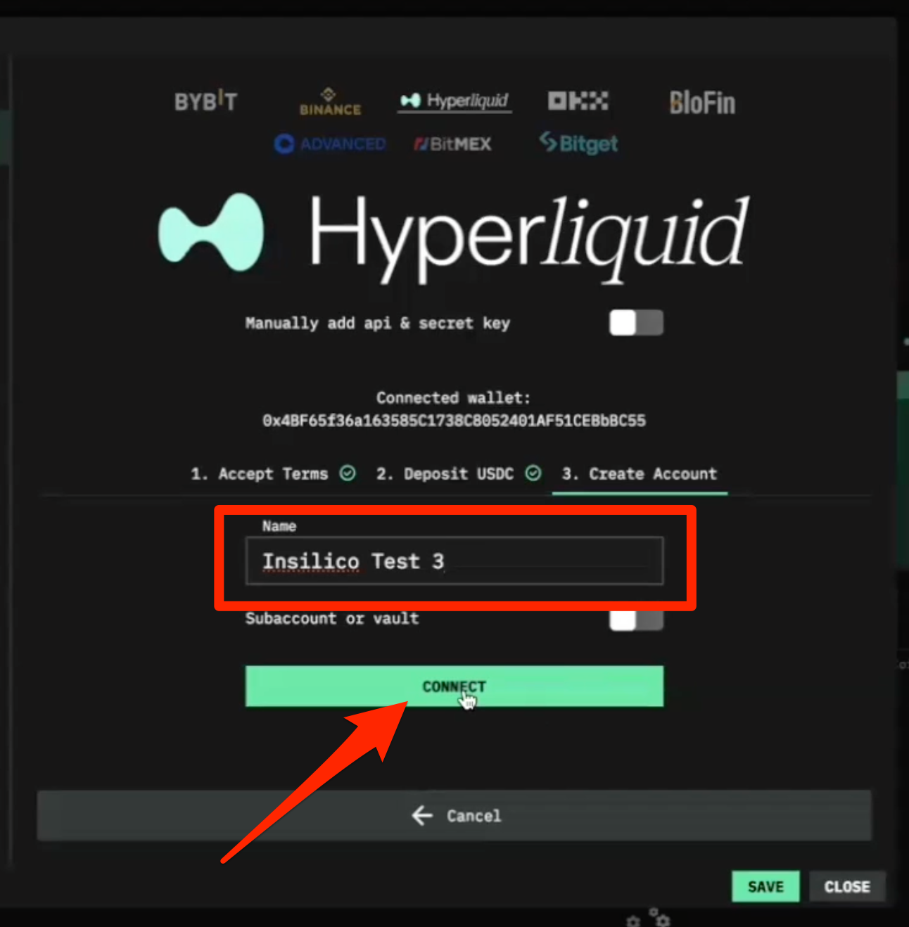 The final step now to activate your Insilico trading dashboard is to confirm the connection between Insilico and Hyperliquid.