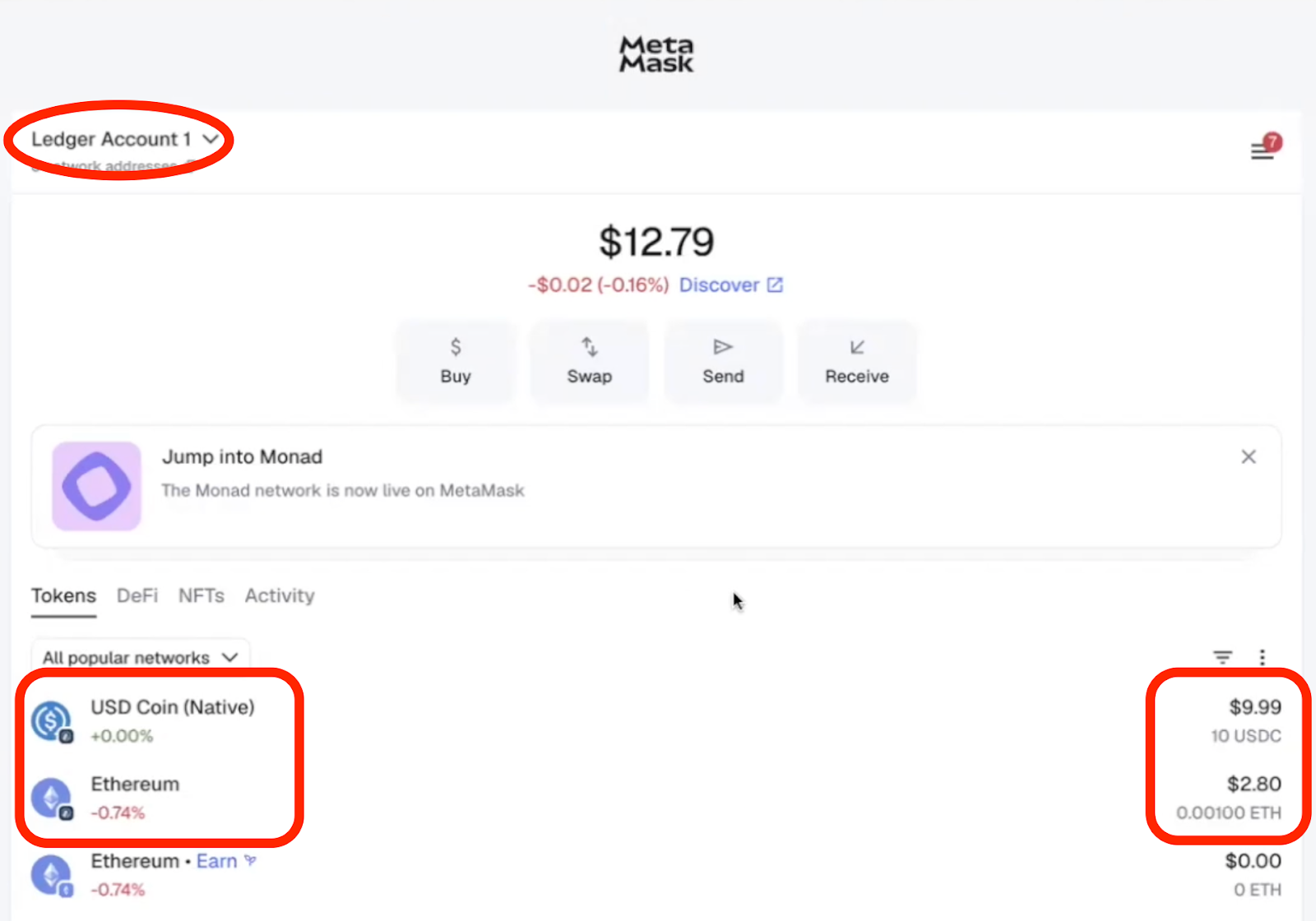 - Approve the connection on the hardware device. You should now be able to see your hardware wallet account in Metamask, along with the ETH and USDC balances on the Arbitrum network: