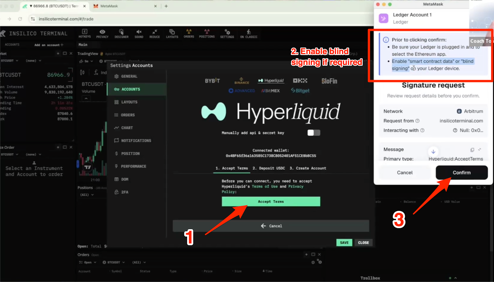 - Agree to the Hyperliquid terms & conditions and privacy policy, confirm it in Metamask, and sign off on your hardware wallet:
