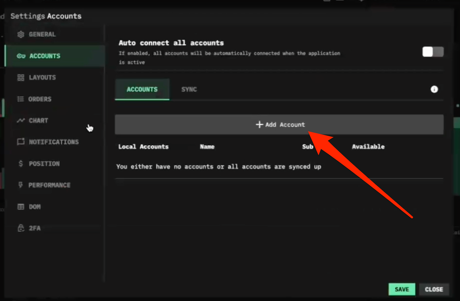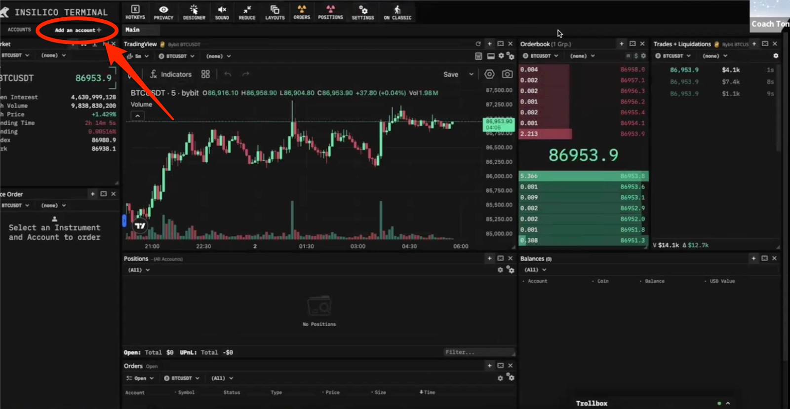 - Once back on the trading interface, click on “Add an account” in the top left:
