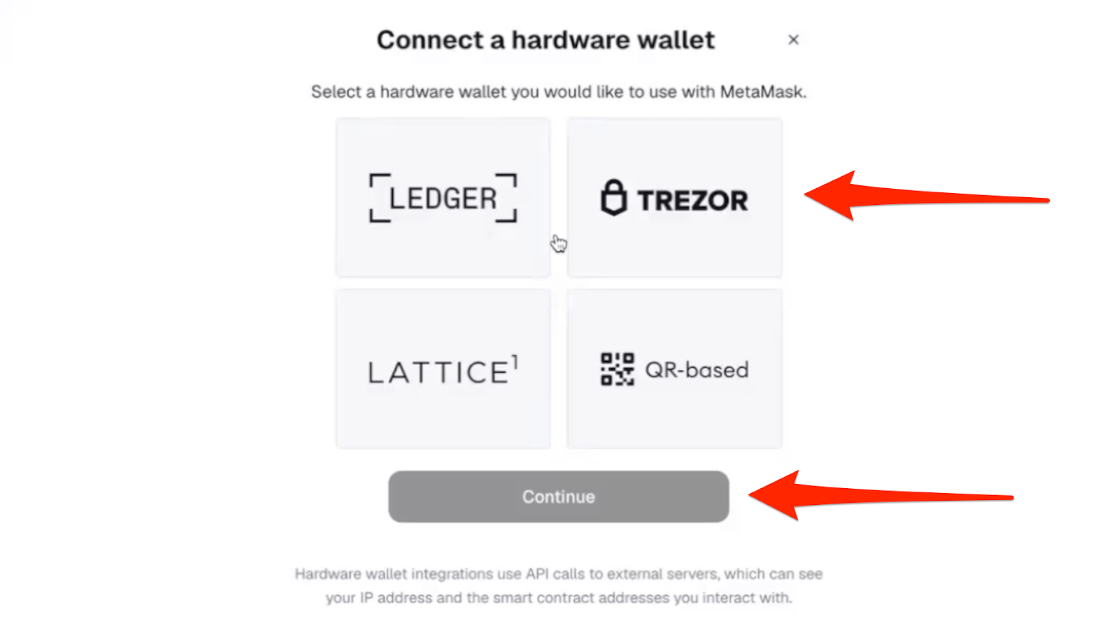- Choose your wallet type (Ledger / Trezor / etc) and click “Continue”: