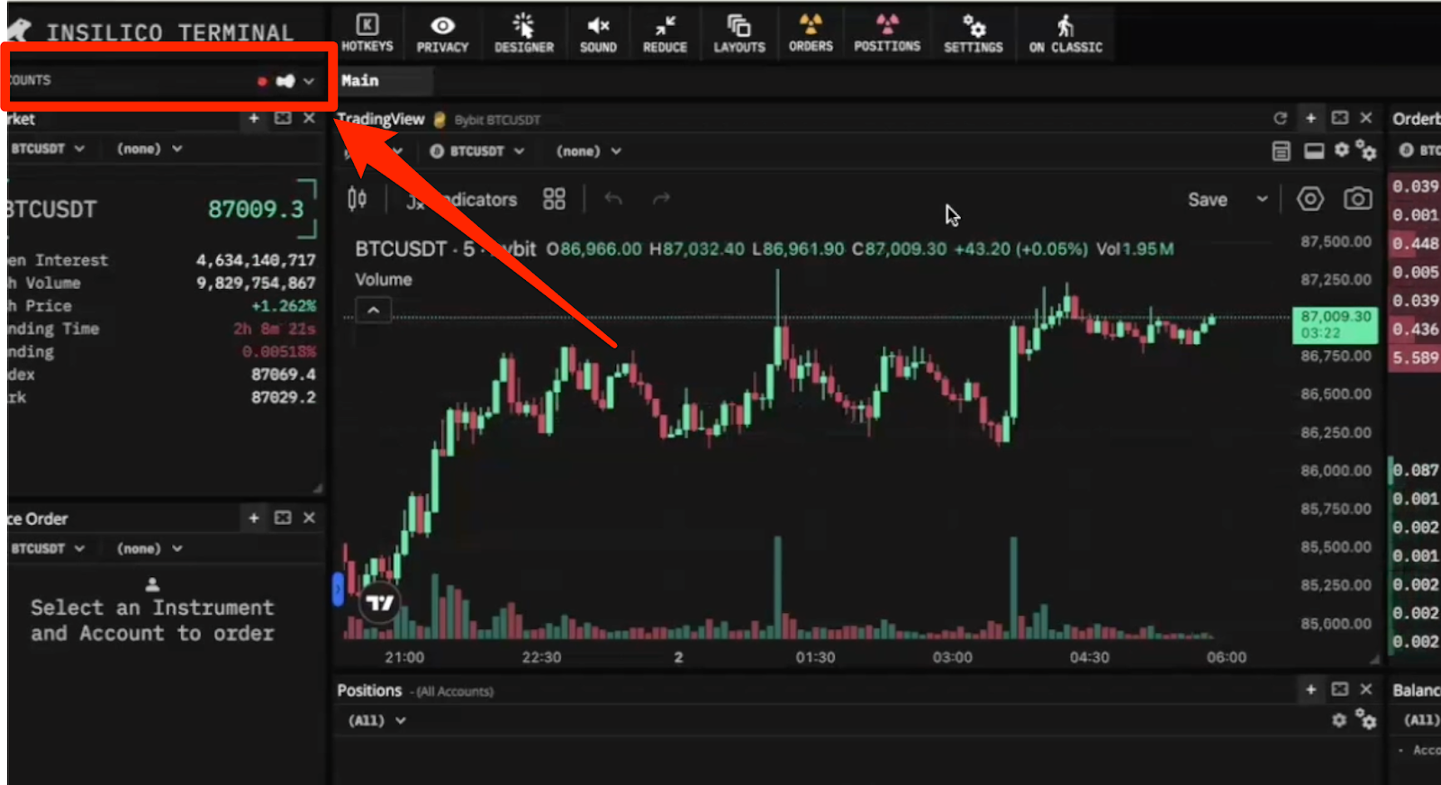 - To do that you go to the top left of the Insilico trading terminal, and find “ACCOUNTS”: